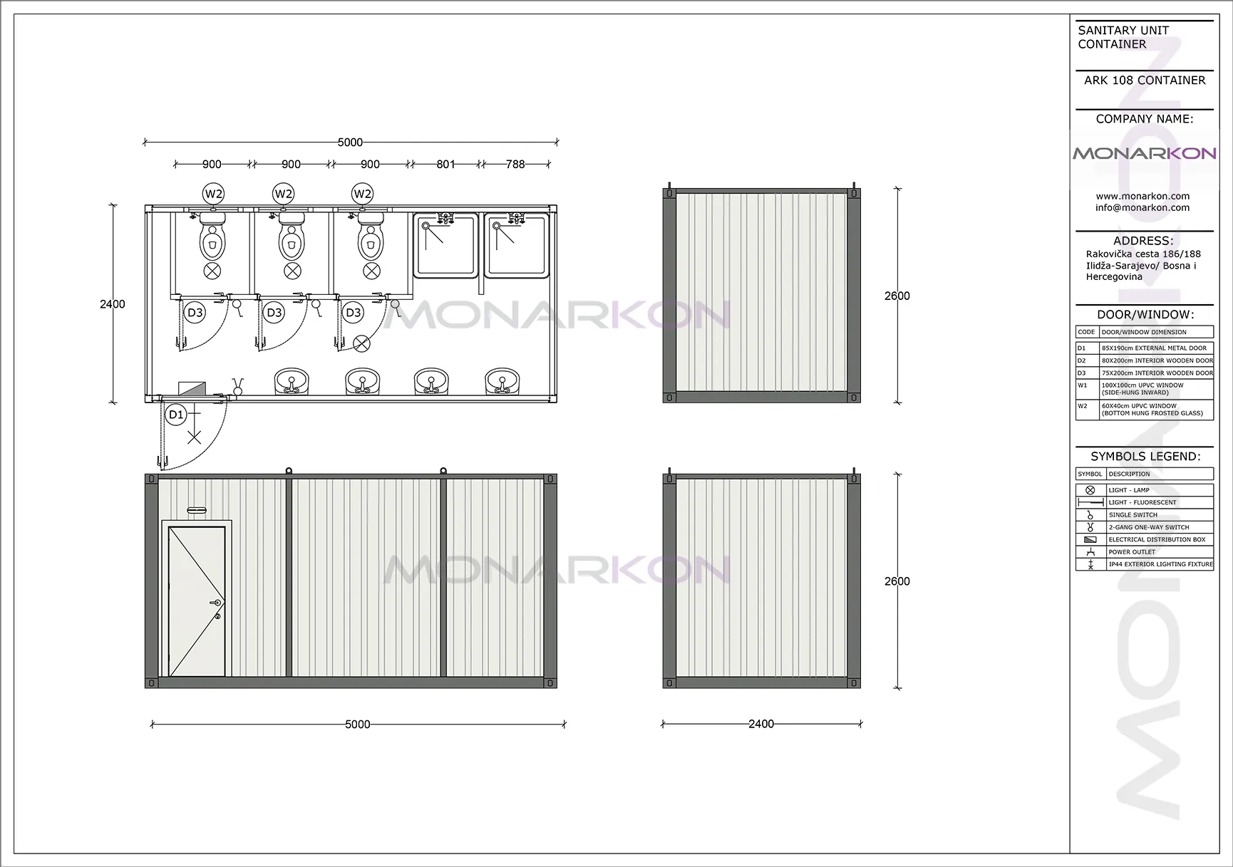Sanitarni kontejner ARK 108 površine 12,00 m² (dimenzije: 240 cm × 500 cm), osmišljen je da pruži maksimalnu sanitarno-higijensku funkcionalnost. Sadrži tri WC-a, dva tuša i četiri umivaonika — idealan za kampove, privremene smještaje, gradilišta ili događaje s velikim brojem korisnika.