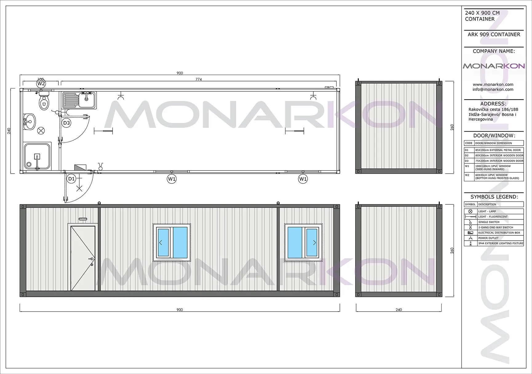 Pregled 3D stambenog kontejnera ARK 909 Modularni stambeni kontejner ARK 909 – vanjski izgled sa dvostrukim vratima i prozorima